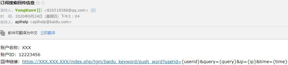 发送订阅邮件到百度那边之后,静等1-2天左右吧, 会收到百度那边是否给您该账户开通订阅搜索词权限接口的接口设置的,如果回复说已经给您的账户开通订阅搜索词权限,就可以设置回传搜索词接口了。
